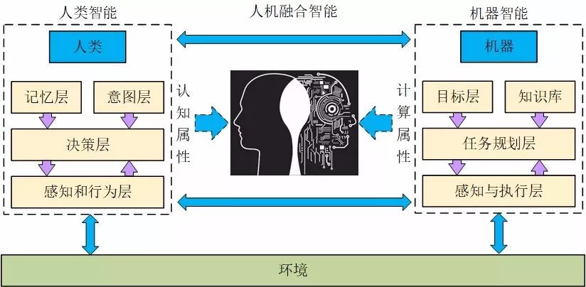 目前人工智能最难突破的是非家族相似性的漫射、影射问题,人机合作则有利于该问题的解决:人的意向性是形而上,机的形式化是形而下,人机融合就是两者虚实之间的道器结合。差异会产生变化的动力,人是容易感知到前提条件变化差异的,机器对此应对明显不足,如何使机器产生感知外部前提条件的变化,并依此而随机应变。例如,人类的词语、概念、语义不是固定的,是随着情境的变化而自然变化的,而机器的这种畸变就小的多或基本没有,这也是人机融合的一大障碍,变与不变的对立,如何统一就是关键点。需要强调的是:军事智能中的人机合一,不是简单的“人心+机脑”,而是人(单人、多人、敌我)+机(机器装备+机制管理)+作战环境(真实+虚拟)体系的交互统一,如图2所示。
