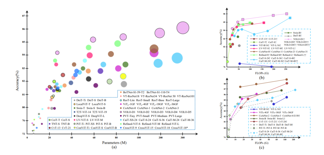 ImageNet-1k基准上最近的视觉变换器比较,包括ViT [27], DeiT [38], BoTNet [44], VTs [43], ConViT [45], CeiT [46], LocalViT [47], TNT [52], Swin [33], PiT [57], T2T-ViT [56], PVT [39], CvT [34], DeepViT [59], CaiT [40], Cross ViT[108](彩色浏览效果最好)。(a)上述模型在2242分辨率输入下的气泡图,周期大小为GFLOPs。(b)与高分辨率输入比较,方框表示4482输入分辨率。(c) ImageNet-21k上一些预训练模型的精度图。