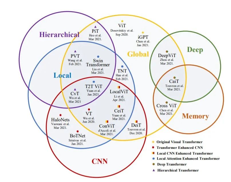 去年发表了几篇关于Transformer的综述,Tay等[86]综述了Transformer在NLP中的效率,Khan等[87]和Han等[88]总结了早期的视觉变形和先前的注意力模型,以及一些没有系统方法的语言模型。Lin等人介绍了Transformer的最新综述,对Transformer的各种变体进行了系统的综述,并简要地提到了可视化应用[89]。基于这些观察,本文旨在对近期的视觉Transformer进行全面的回顾,并对现有的方法进行系统的分类: