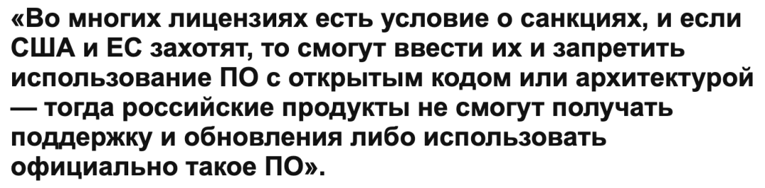 俄国EBR律师事务所的合伙人Alexandra Zhuravleva称:「许多开源软件许可证都有关于制裁的条款。如果美国和欧盟愿意,他们可以引入这些条款,并禁止俄国人使用开源软件或架构——那么俄罗斯产品将无法获得正式使用此类软件应有的支持和更新。」
