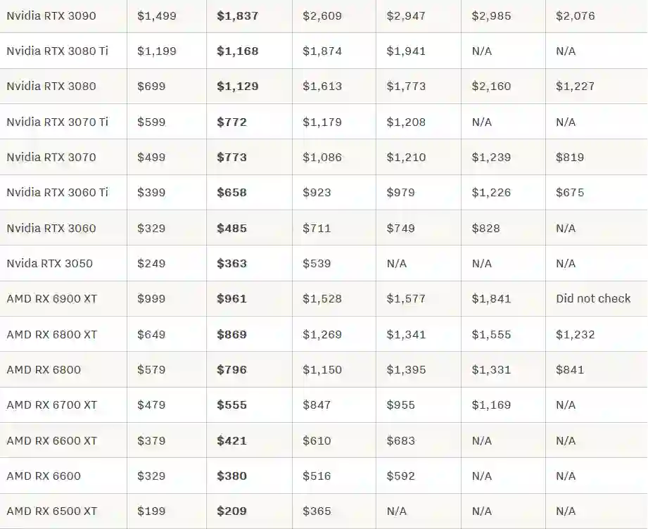 三月底,两者都比厂家建议零售价高出25%,而英伟达显卡现在平均比厂家建议零售价高出19%,而AMD显卡现在平均比厂家建议零售价高出12%。