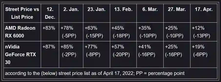 「3D中心」之前的数据显示,截至三月底,德国区的英伟达和AMD的显卡均比厂家建议零售价只高出约25%了。