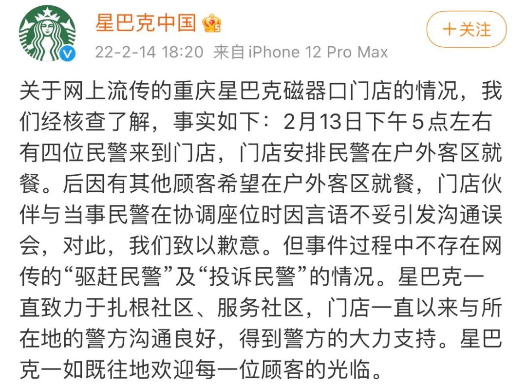 星巴克发文致歉:不存在驱赶投诉民警情况,因言语不妥引发沟通误会