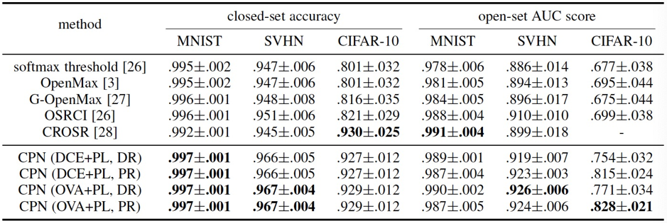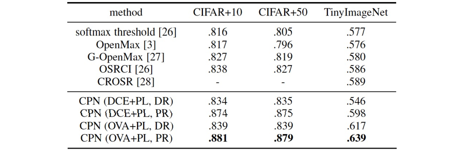 从表4和表5中可看出,相对已有方法,CPN在开放集识别任务中有很大的性能优势。相比已有方法,CPN更加高效,其不需要额外的训练数据,不需要复杂的未知样本判断逻辑,且可进行端到端的训练。