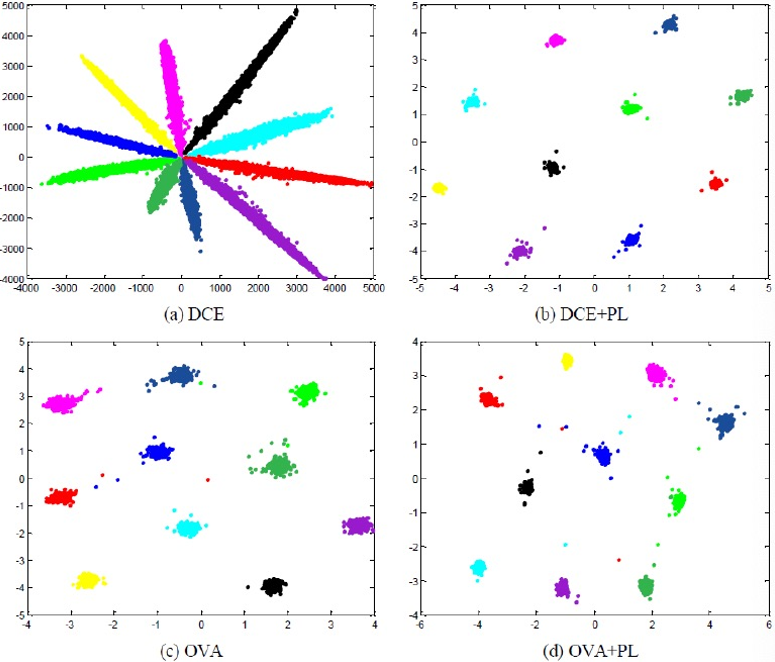 从生成损失的定义中可看出,最小化生成损失可压缩类内特征分布。通过与判别损失配合,CPN可学到类内紧致,类间分隔的特征分布。此种分布可预留更大的空间给未知类,故可提高CPN在开放集识别中的可用性。