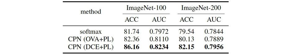 我们进一步在ImageNet上进行实验来考察CPN的开放集识别性能。在ImageNet中,分别采取前100/200类作为已知类,其他类作为未知类,相关实验结果如下表所示: