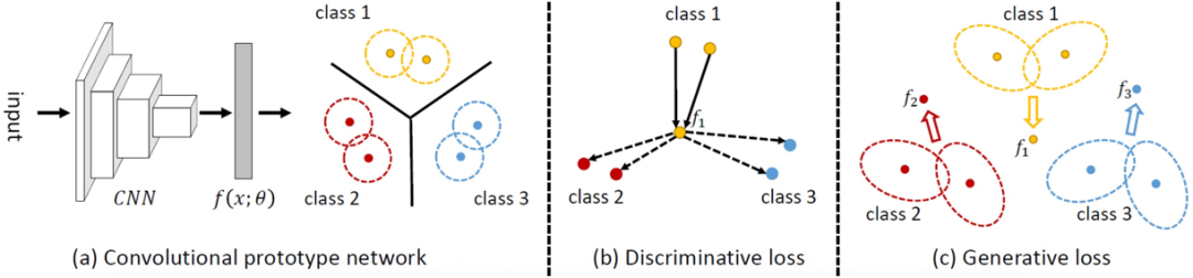 图1(a)卷积原型网络架构;(b)判别损失基本原理;(c)生成损失基本原理