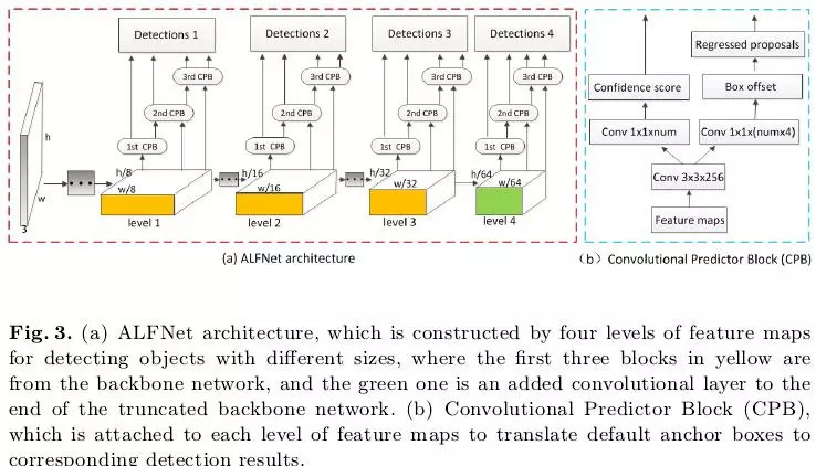基于以上渐近定位模块(ALF),作者以ResNet-50为基础网络为例,给出了ALFNet检测器的网络架构,如下图3所示,选用ResNet-50的第3、4、5个stage的最后一层(黄色部分)以及新接的一层(绿色部分)作为多尺度特征图(分别较原始图像降采样了8、16、32和64倍),在这些特征图上添加ALF模块,也即堆叠多个CPB(图3(b))。训练和测试和通用目标检测器类似,详情可见论文。