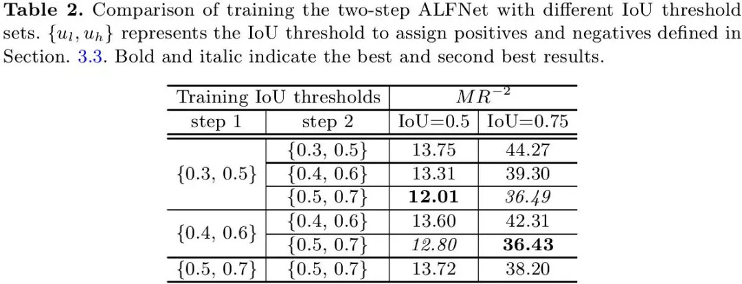 拥有数量急剧上升的正样本,使得利用更高IoU阈值训练检测器成为可能,为此作者做了不同IoU阈值训练的验证实验,如表2所示,以两步的ALFNet为例,实验表明利用提升的IoU阈值训练(从{0.3, 0.5}到{0.5, 0.7})得到了最佳检测性能,这一点和Cascade R-CNN[1]中得到的结论是一致的。