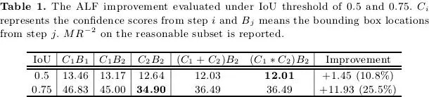 首先我们看下本文的核心模块ALF对检测性能带来的提升,如下表1所示,在IoU=0.5评估设定下ALF使得miss rate下降了1.45提升为10.8%,而在IoU=0.75评估设定下miss rate则下降了11.93,充分验证了ALF可以带来更高的定位精度。