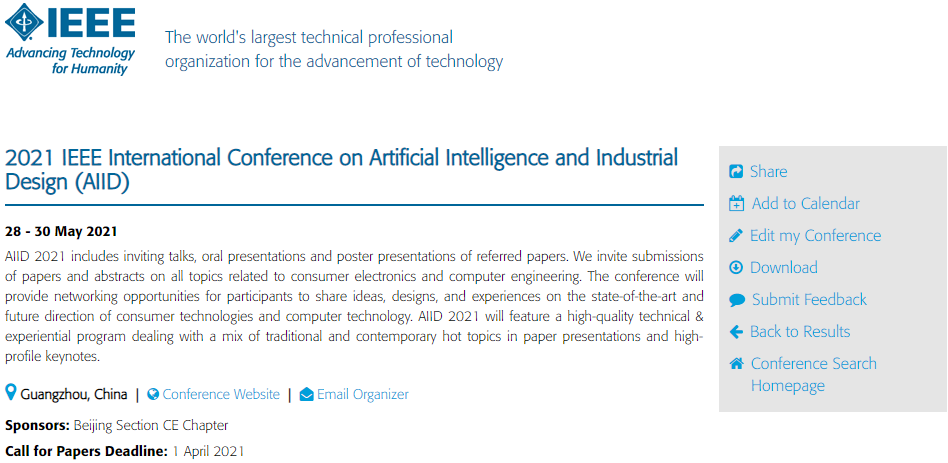 2021年 IEEE 人工智能与工业设计国际会议(IEEE-AIID2021)将汇集世界各地的创新学者、工业专家、工程师、学生和从业者,推动人工智能和工业设计技术领域的科学信息交流以及它们的应用。本次会议主要围绕消费电子发展、人工智能、工业设计等研究领域展开讨论。会议旨在为从事相关科研领域的专家学者、工程技术人员、技术研发人员提供一个共享科研成果和前沿技术,了解学术发展趋势,拓宽研究思路,加强学术研究和探讨,促进学术成果产业化合作的平台。大会诚邀国内外高校、科研机构专家、学者,企业界人士及其他相关人员参会交流。与会代表不仅可以聆听国内外知名专家精彩报告,并且可以亲自参与其中与来自世界各地的专家学者进行面对面的交流与探讨。