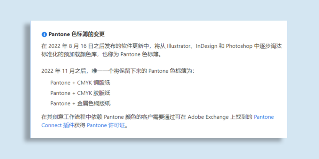 Adobe 在关于在 Illustrator 中使用 Pantone 颜色的书籍中答复道: 带有来自 Pantone 颜色书籍的色板的 Illustrator 文件将在打开或放置在 Illustrator 中时正常工作(包括过去或将来的软件版本)。 带有已放置链接的 Photoshop 文件的 Illustrator 文件,这些文件在 Illustrator 中的颜色不再可用时,使用专色通道渲染灰色 / 黑色。 来自 Adobe 官网 。