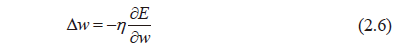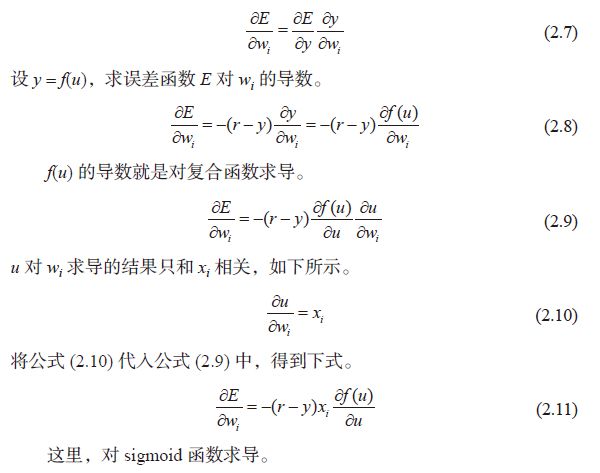 接着再来看一下权重调整值。根据上述说明,权重需要进行调整以使最小二乘误差函数趋近于 0。对误差函数求导就能得到图 2.6 中给定点的梯度,即可在误差大时增大调整值,误差小时减小调整值,所以连接权重调整值 Δw 可以用公式 (2.6) 表示。