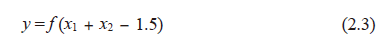 逻辑或(OR 运算符)和逻辑与(AND 运算符)可以使用图 2.3(b) 所示的双输入单输出 M-P 模型来表示。各运算符的输入与输出的关系如表 2.1 所示。根据表中关系,以 OR 运算为例时,公式 (2.1)中的 wi 和 h 分别为 w1 = 1, w2 = 1, h = 0.5,把它们代入公式 (2.1) 可以得到下式。