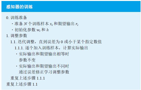 2.2 节中的逻辑运算符比较简单,还可以人为事先确定参数,但逻辑运算符 wi 和 h 的组合并不仅仅限于前面提到的这几种。罗森布拉特提出的感知器能够根据训练样本自动获取样本的组合 [55]。与 M-P 模型需要人为确定参数不同,感知器能够通过训练自动确定参数。训练方式为有监督学习,即需要设定训练样本和期望输出,然后调整实际输出和期望输出之差的方式(误差修正学习)。误差修正学习可用公式 (2.4) 和(2.5) 表示。