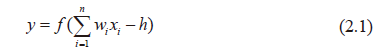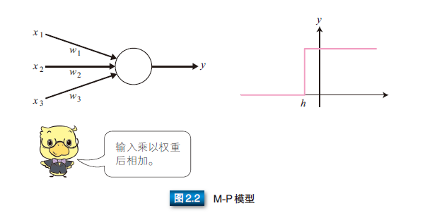 M-P 模型是首个通过模仿神经元而形成的模型 [43]。如图 2.2 所示,在 M-P 模型中,多个输入节点 {xi | i = 1, ..., n} 对应一个输出节点 y。每个输入 xi 乘以相应的连接权重 wi,然后相加得到输出 y。结果之和如果大于阈值 h,则输出 1,否则输出 0。输入和输出均是 0 或 1。