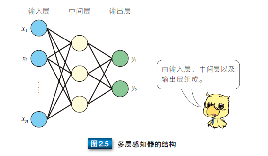 为了解决线性不可分等更复杂的问题,人们提出了多层感知器(multilayer perceptron)模型。如图 2.5 所示,多层感知器指的是由多层结构的感知器递阶组成的输入值向前传播的网络,也被称为前馈网络或正向传播网络。