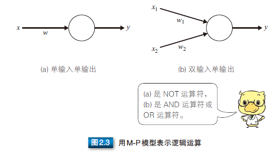 M-P 模型可以表示 AND 和 OR 等逻辑运算。如图 2.3 所示,M-P模型在表示各种逻辑运算时,可以转化为单输入单输出或双输入单输出的模型。