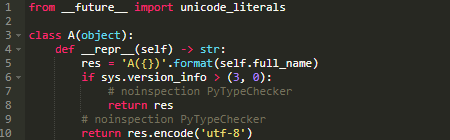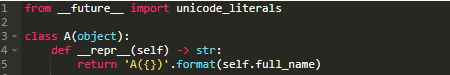 这段代码是有bug的。在python3下运行是正确的,但在python2下不行,这是因为在python2环境中,解释器期望__repr__方法返回bytes类型的数据,然而Unicode_literals的引入使得返回值实际上为unicode类型的。本例中,将下一个版本的新特性引入意味着不可能编写一个同时满足python2和python3的类型需求的__repr__方法。你需要加入运行逻辑来使代码做正确的事情: