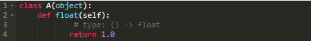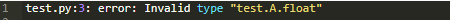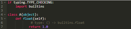 有人可能会问这到底是怎么回事。我给返回值的定义是float类型而不是test.A.float类型。出现这种混淆错误的原因时类型提示通过定义的位置出发评估每一个遇到的范围来解析类型。一旦找到匹配的名称,它就停止了。本例中类型提示所查找的第一层次是在类A中,在这里它找到了一个float(float函数)并进行了替换。