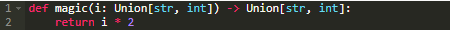 你输入的类型是str或者int,你的返回值相应的也是str或int。然而,如果如上图中那样做,你实际上是在告诉类型提示输入的类型可以是这两种类型中的任意一种。因此,作为调用方,你需要声明调用的类型: