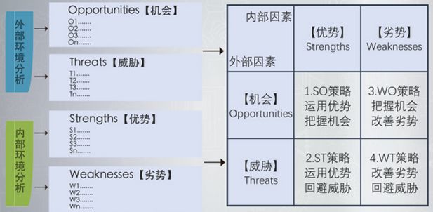 内部因素 + 外部因素就构成了企业(产品)战略,所以企业(产品)战略的公式为:企业(产品)战略=内部因素(SW)+ 外部因素(OT)