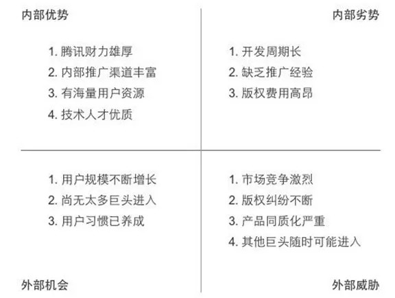 即使找出了影响产品的内部因素和外部因素,但各因素还是孤立存在的,只有将各因素结合来分析才能真正得出我们想要的分析结果。在优势环境下可能存在外部威胁,在劣势环境下也可能存在发展机会,只有综合看待内部及外部变化才能得出正确的分析结果。