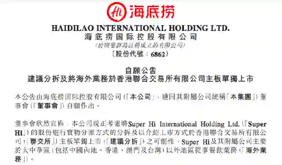 海底捞董事会认为,建议分拆符合公司及股东的整体利益,能够让Super Hi及集团其余业务在其各自地域范围内获得更好发展,并在一个独立的上市平台上产生未来的增值收益。