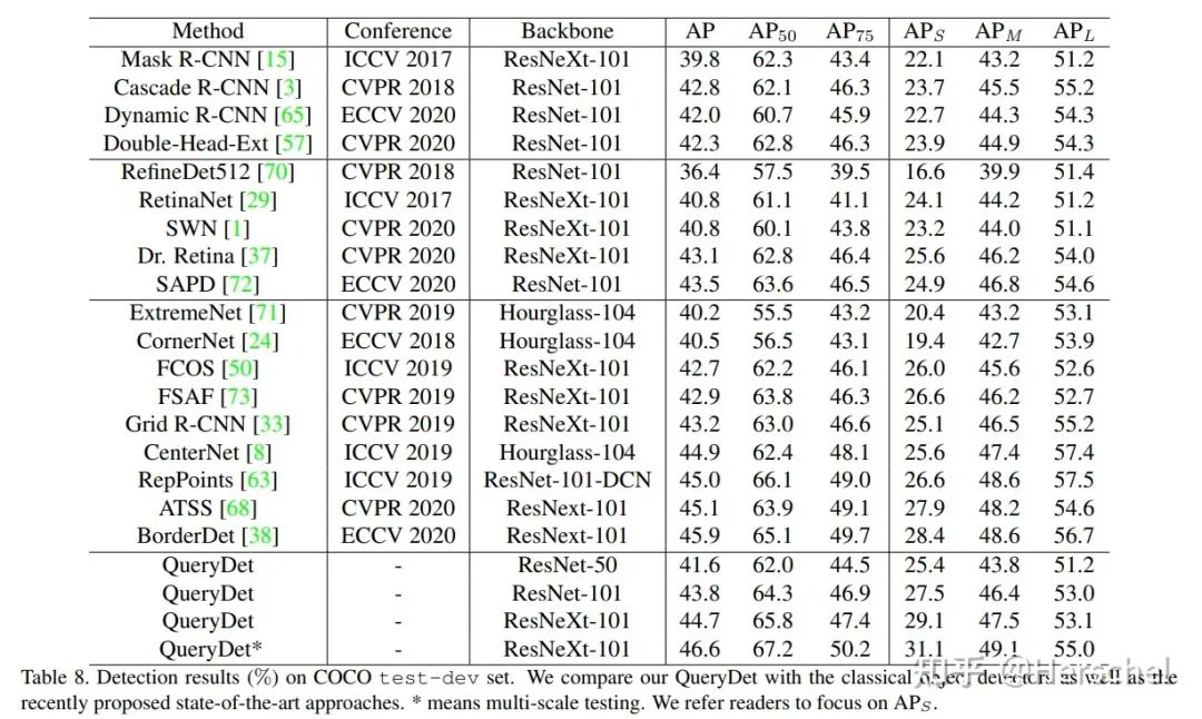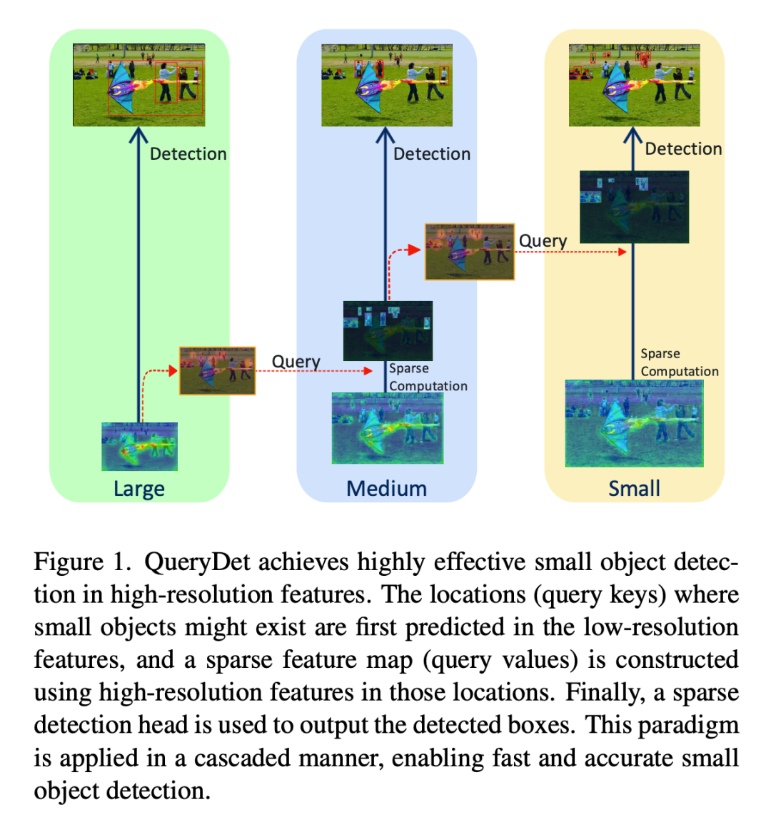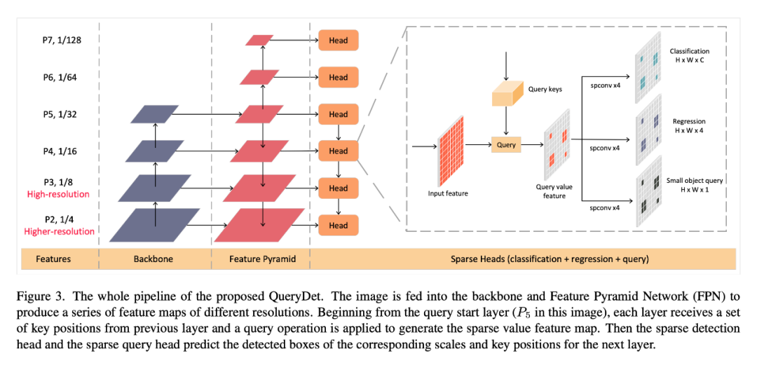 QueryDet 利用 high-resolution feature 来提升小目标检测性能的同时,通过 CSQ 机制,利用高层低分辨率特征初筛含有小目标的区域,在高分辨特征层上利用初筛获得的位置,使用 sparse convolution,极大地节约了计算消耗。