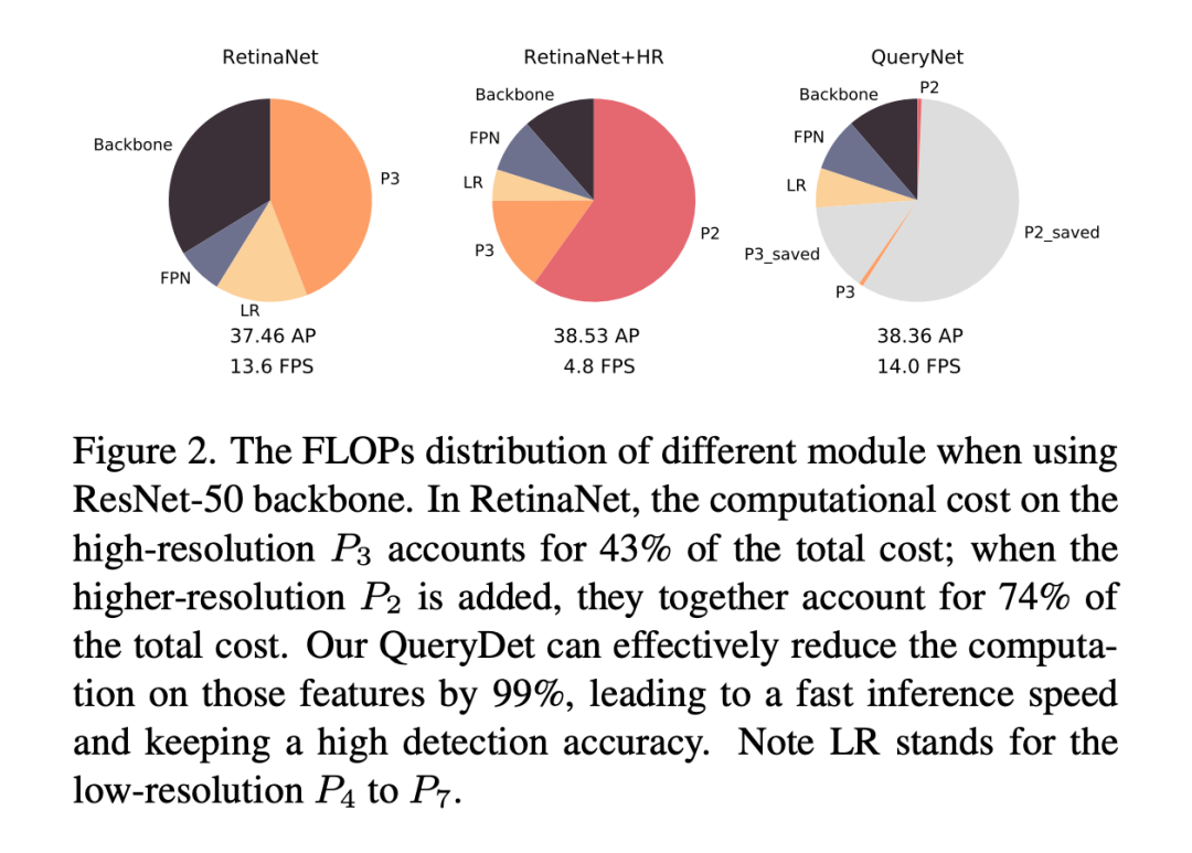可以看出原版 RetinaNet 中,最低层 P3 就占据了总计算量的很大部分;引入更高分辨率的 P2 助力小目标检测后,P2 的计算开销占到了总开销的一半以上;加入最终模型 QueryDet 进行比较,可以看出 QueryDet 在减小高分辨率上的计算开销同时提高了推理速度。