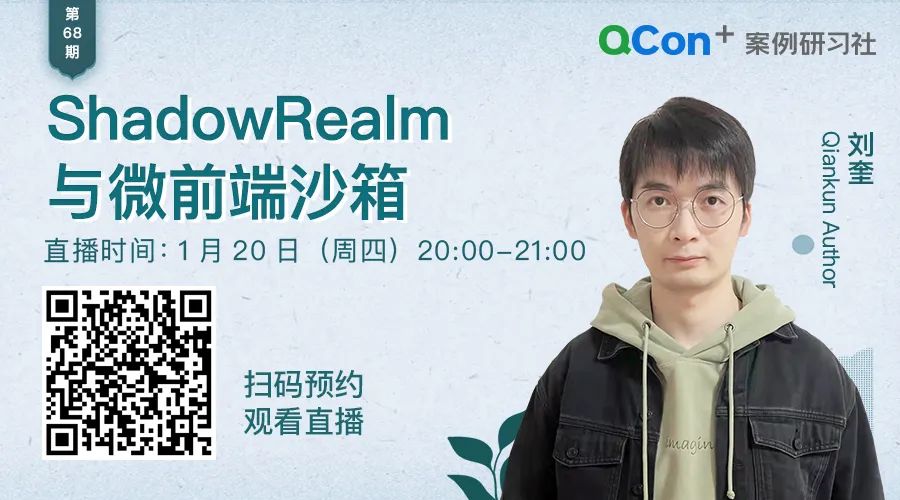 今晚 8 点,Qiankun Author 刘奎将直播分享「ShadowRealm 与微前端沙箱」,探索 ShadowRealm 在微前端场景的实践及结合思路。