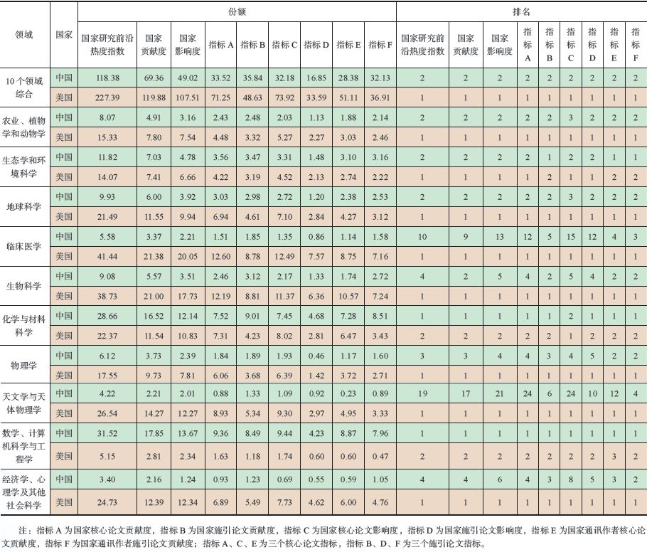 在10 个领域综合层面,美国研究前沿热度指数等9 个指标均排名第一,中国则在9 个指标上都稳居第二。但是从数值上来看,中美研究前沿热度指数得分分别为118.38 分和227.39 分,中国约为美国的一半。中国和美国的国家贡献度得分分别为69.36 分和119.88 分,中国是美国的57.86%。中国和美国的国家影响度得分分别为49.02 分和107.51 分,中国是美国的45.60%。在指标A、B、C、D 方面,中国为美国的47.05%、73.70%、43.53% 和50.16%。在指标E 方面,中国是美国的55.53%,超过美国的一半。在指标F 方面,中国是美国的87.05%。从上述中美9 个指标的对比可以看出,除了施引论文的数量中国与美国的比值略高以外,其他核心论文数量和影响度,中国仅仅占美国的一半左右。因此从综合指标上可以看出中国与美国在研究前沿位势上仍存在较大差距。