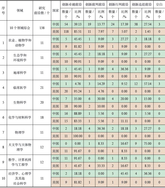 在10 个领域的138 个前沿中, 美国有118 个(85.51%) 创新卓越前沿、11 个创新前列前沿、7 个创新行列前沿、2 个创新追赶前沿。中国则有54 个(39.13%)创新卓越前沿、19 个创新前列前沿、24 个创新行列前沿、38 个创新追赶前沿,处于空白状态的有3 个。中国的创新卓越前沿还不到美国的一半,70.29%的前沿处于创新行列及以上(包括创新前列和创新卓越)。