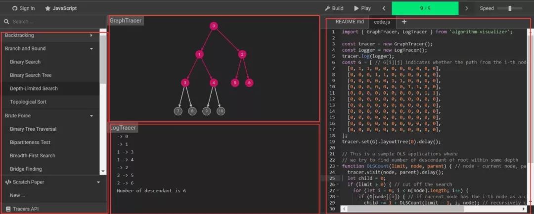 下面通过depth limited Search,大概解释一下 Algorithm Visualizer 这个工具: