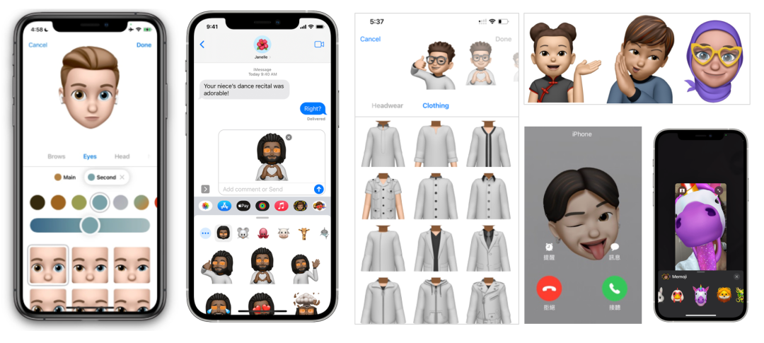 具有国际化并多样性的素材可供用户DIY自己的头像和下半身(腰部以上)该功能与facetime和iMassage互联,将能在视频通话和短信发送上增添更多互动与乐趣。