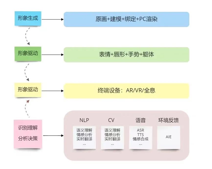 手机虚拟人作为虚拟人在移动端上的落地产品,其技术架构与常规虚拟人类似,其通用系统框架可分为形象生成、形象驱动、形象渲染以及识别理解+分析决策模块。