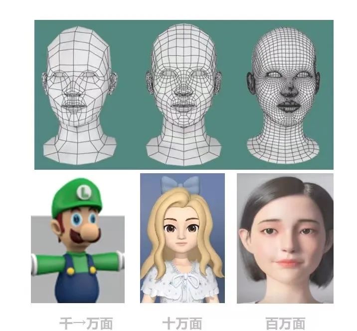 以上六类虚拟人的外形差异主要是由精度和面数所决定的,面数越高则精度越高也就越可以朝真人的外观接近。