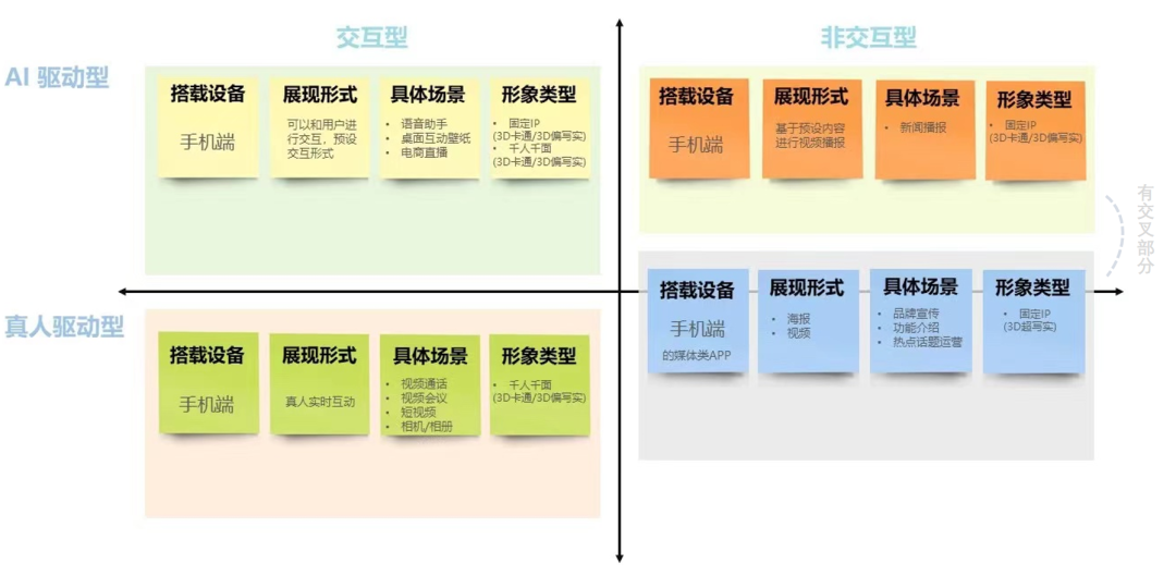 移动端使用场景通常是交互方式与驱动方式综合影响的结果,根据有交互/无交互,真人驱动/AI驱动;移动端的使用场景可划分为:语音助手、桌面互动壁纸、电商直播、新闻播报、视频通话、视频会议、短视频、相机、相册等。