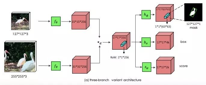 下图展示了其整天算法流程。左侧上面图像为框出来的目标图像,左侧下面图像为要搜索目标位置的视频中的一帧,经过卷积网络,生成Row(response of a candidate window,候选窗口响应),网络后面有三个head,除了在SiamFC法中已经存在的预测box(目标位置)的head和预测响应score(目标出现概率)的head,作者增加了预测目标mask(目标二值掩码)的head。