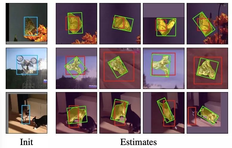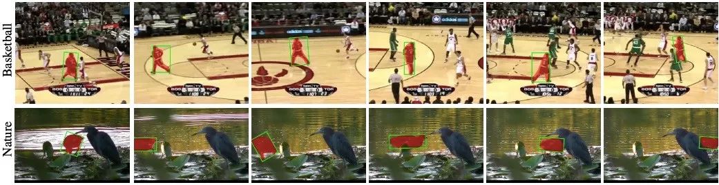 上图中,左侧是初始化的操作,在视频第一帧给出目标的包围框,右侧的多张图像为普通的跟踪算法计算得到估计的包围框和SiamMask估计的目标的分割mask。