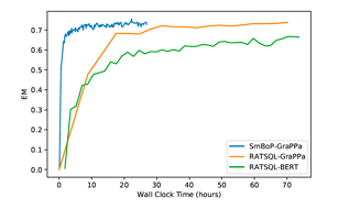 在Spider数据集上,与使用自回归解码的语义解析器相比,SMBOP 使解码时间加快了 2.2 倍,训练时间加快了 5 倍,获得了69.5%的完全匹配准确率, 71.1 %的执行准确率。