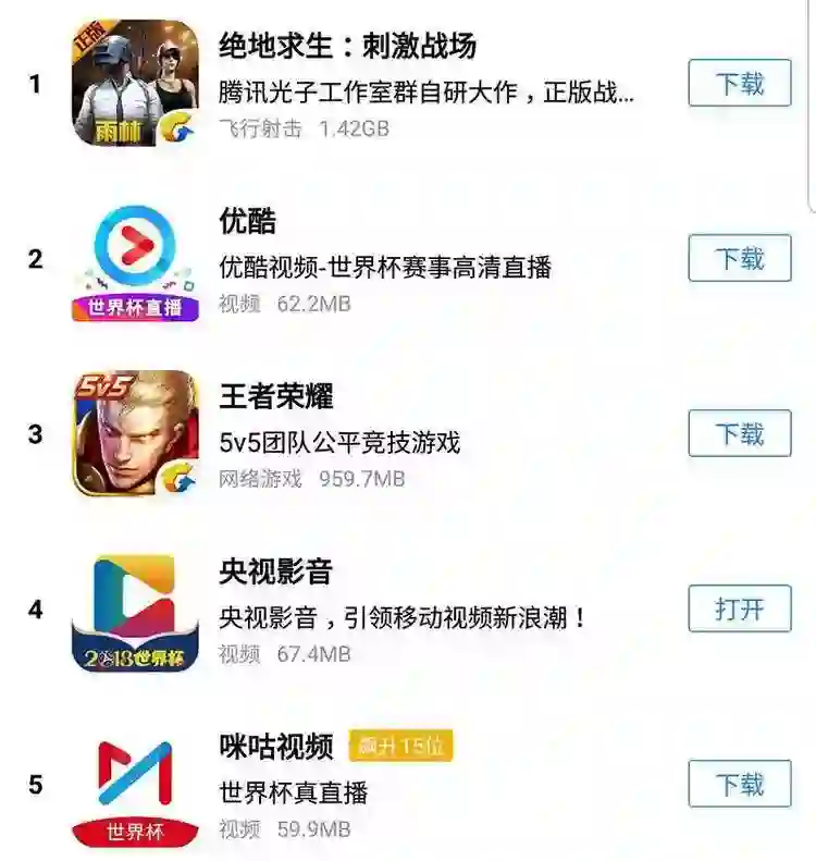 从央视影音到优酷 app 再到咪咕视频,更加多样化的观赛渠道,让观看比赛这件事情变得更加简单了。同时,凭借着世界杯这个超级 IP,也让它们成为了这段时间受关注度最高的应用。