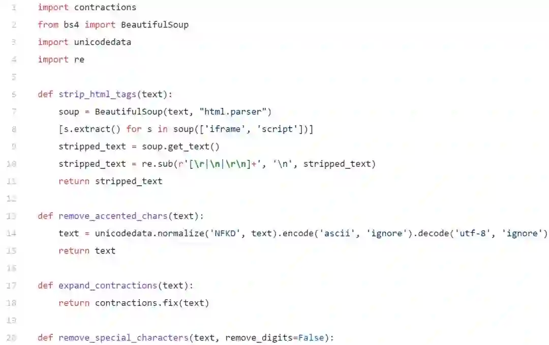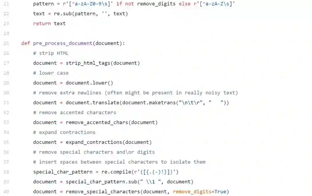 我们有一些基本的文本预处理需要做,以从我们的文本消除一些噪音,如不必要的特殊字符,html标签的清除等。