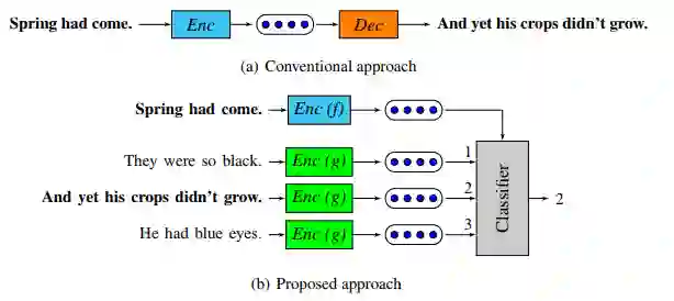 因此,给定一个句子及其出现的上下文,分类器根据它们的嵌入表示来区分上下文句子和其他对比句子。给定一个输入语句,它首先使用某种函数进行编码,但是模型没有生成目标句子,而是从一组候选句子中选择正确的目标句子。将生成看作是从所有可能的句子中选择一个句子,这可以看作是对生成问题的一种判别近似。