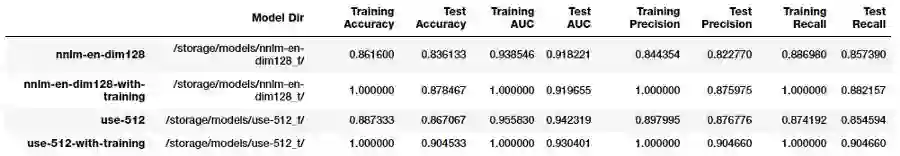 现在让我们尝试根据不同的句子嵌入构建不同的深度学习分类器。我们将尝试以下几点:
