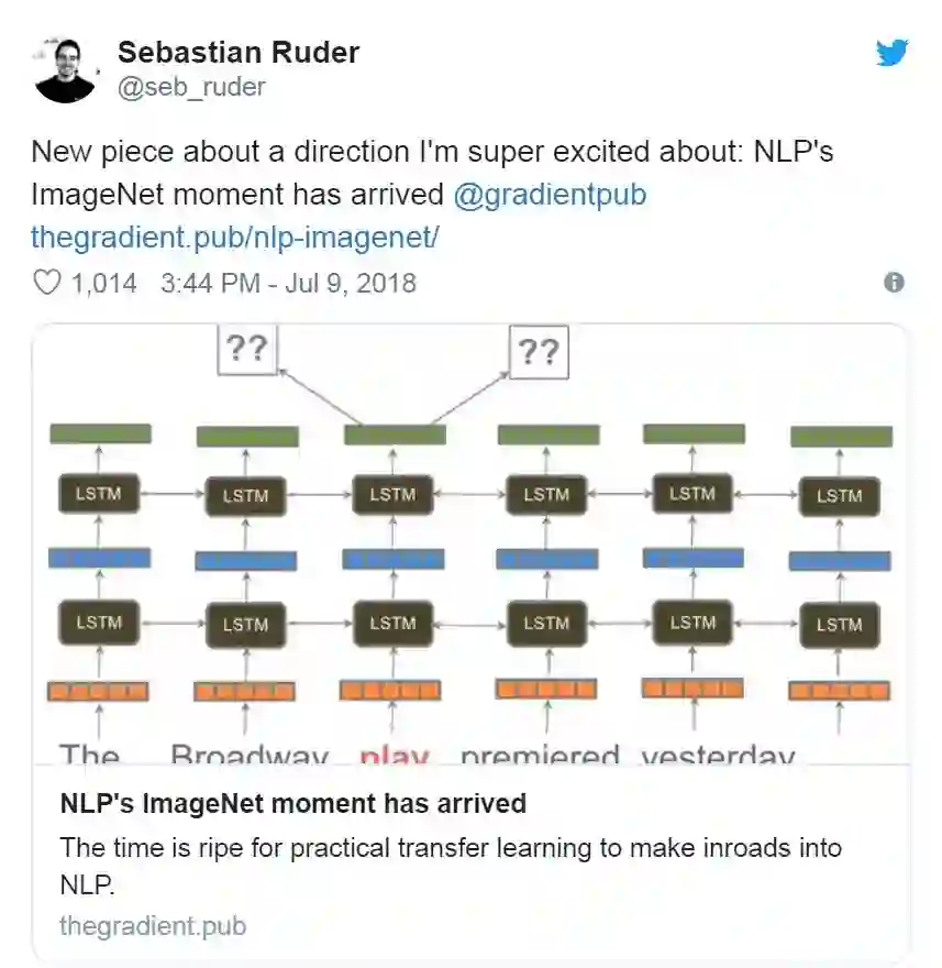对于不同的NLP任务,通用句子嵌入无疑是在支持迁移学习方面向前迈出的一大步。事实上,我们已经看到像ELMo这样的模型,通用句子编码器,ULMFiT确实成为头条新闻,因为它展示了预先训练过的模型可以用来在NLP任务上实现最先进的结果。著名的研究科学家和博客作者塞巴斯蒂安·鲁德(SebastianRuder)在推特上提到了同样的问题。