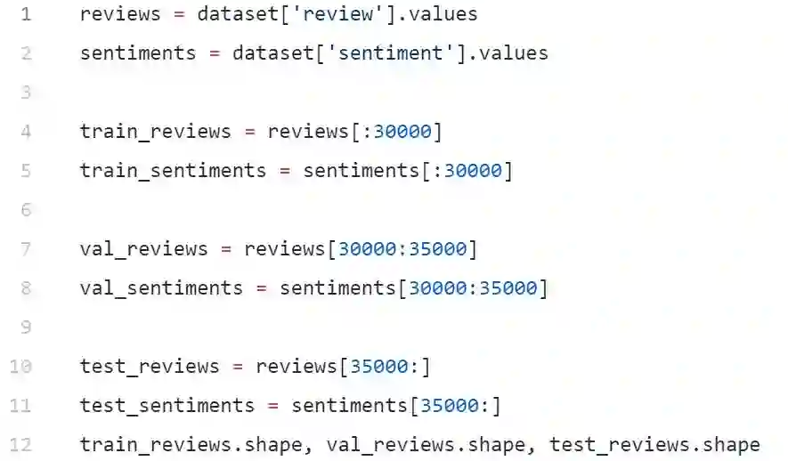 在开始建模之前,我们将创建训练、验证和测试数据集。我们将使用30000条评论用于训练,5000条用于验证,15000条用于测试。你可以使用train_test_split() from scikit-learn。我只是很懒,用简单的列表切片对数据集进行了细分。