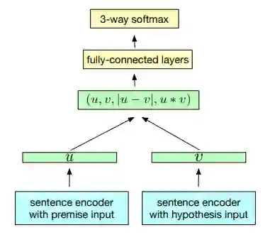基于上图所描述的体系结构,我们可以看到,它使用了一个共享语句编码器,它为前提u和假设V输出一个表示。一旦生成句子向量,就可以使用3种匹配方法来提取u和v之间的关系: