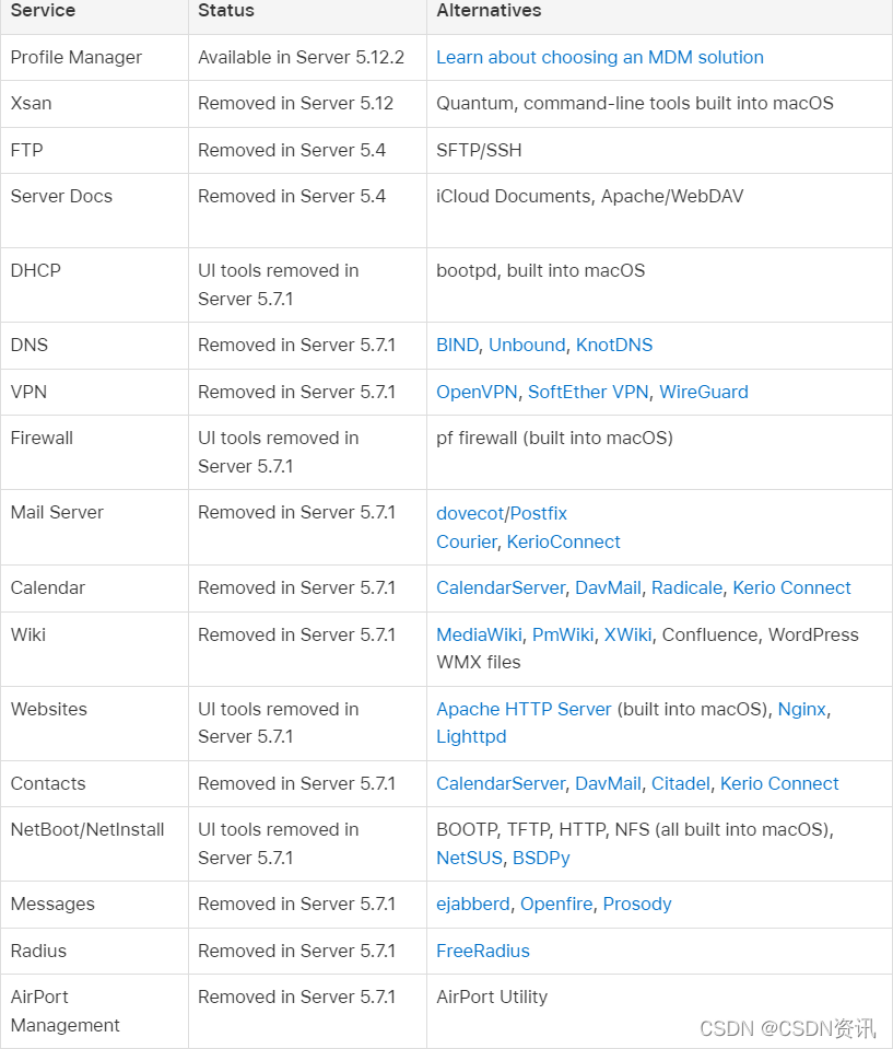 该表格显示了 macOS Server 的服务状态及可替换品。