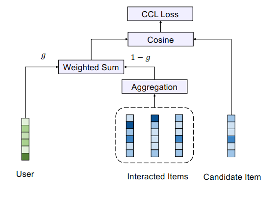 下图是本文总结的算法架构图(文中声明其并不novel,因为在多个工作中都有类似的结构,比如YoutubeNet,该文重点是在探索在这样简洁的框架下损失函数和负采样对实验结果的影响),可见其比较简单直白,用户表示方面主要是将用户的隐特征向量与历史交互物品的隐特征向量进行了加权求和,其中历史交互物品的隐特征向量通过多种聚合方式实现,然后通过将用户的特征表示与候选物品的特征表示求余弦相似度进行比较,最终利用余弦对比损失CCL进行模型优化。